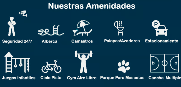 El desarrollo cuenta con seguridad 24/7, juegos infantiles, parque para mascotas, ciclo pista, alberca, palapas con asadores, gimnasio al aire libre, camastros, cancha de usos múltiples y estacionamiento para visitantes.